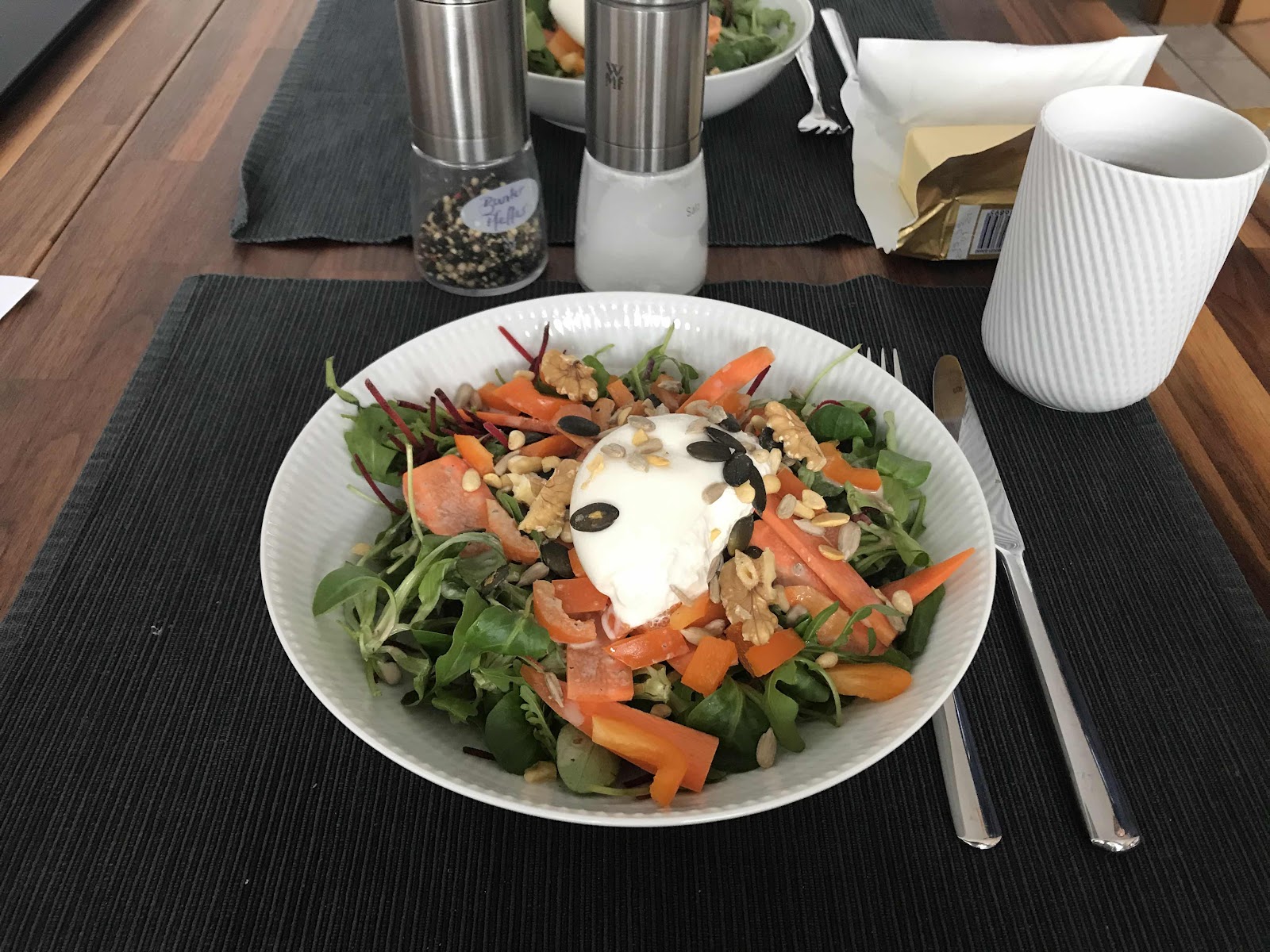 Am Samstag gehen wir, wie eig. jedes Wochenende, das wir hier im Hochsauerland (Achtung, externer Inhalt!) verbringen (und das sind in letzter Zeit ja leider überdurchschnittlich viele), in der Stadt unseren Wocheneinkauf erledigen. Auf Mittag essen wir, aufgrund der fortgeschrittenen Zeit, einen Salat, der schnell gemacht ist. Wir teilen uns eine Burrata dazu - einer unserer liebsten Käse in letzter Zeit. Nachdem der KSM die ganze Woche immer wieder für mich gekocht hat, ist es am Samstag an mir, das Essen zu machen. Der Salat entsteht also aus einer Salatmischung, sämtlichem Gemüse, das wir aktuell im Kühlschrank haben und einem Sahne-Balsamico-Dressing (Achtung, externer Inhalt!). Wir streuen noch eine paar Kerne und Walnüsse darüber und natürlich die Burrata ... et voilà. Sehr lecker. 😋