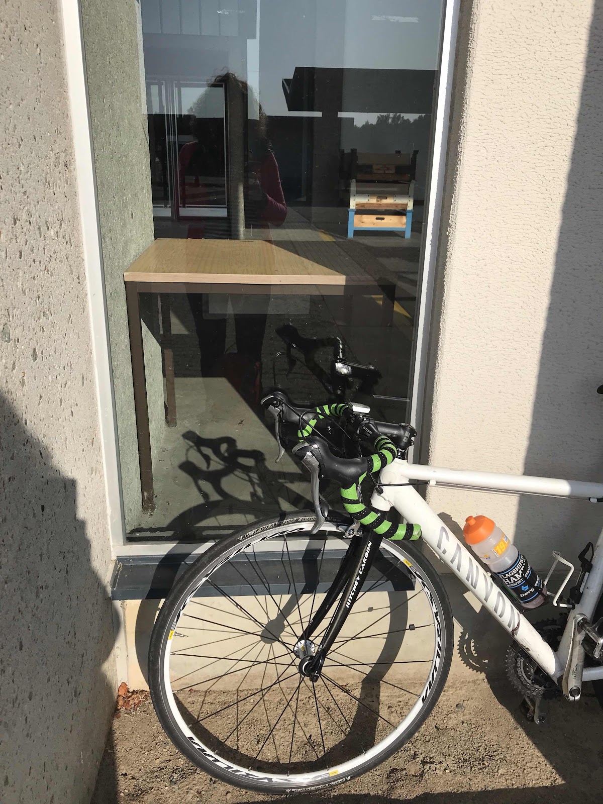Das hier ist übrigens meine "Abstellkammer- und Fahrradgarage". Hier trocknen meine Radklamotten über den Arbeitstag, damit ich sie zur Heimfahrt wieder anziehen kann (Naja, nach einmal tragen hält sich der olfaktorische Faktor noch in Grenzen – das geht schon. 😉) und hier steht das Drahteselchen, damit es niemanden stört und nicht "weg kommt". 😊