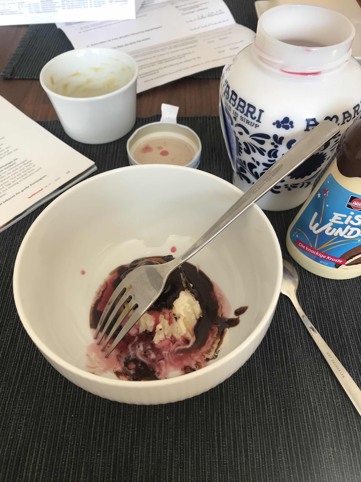 Am Montag der neuen Woche esse ich zum Mittag das Eis auf, das wir für den Familienbesuch extra gemacht hatten (Sie erinnern sich?). Ich esse es mit Amarenakirschen und EisWunder dem letzten Rest der Salzkaramellsauce - wenn schon, denn schon. 😋